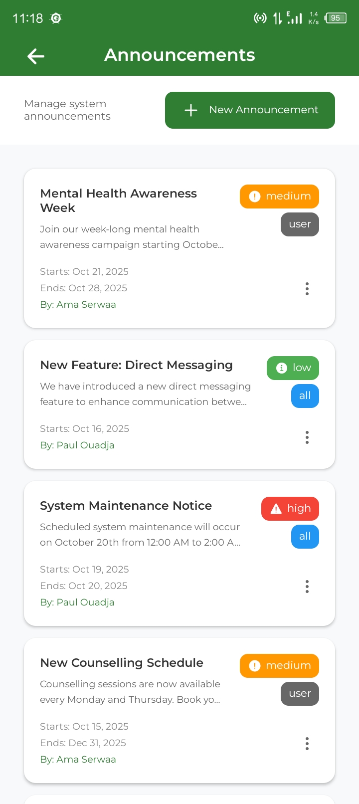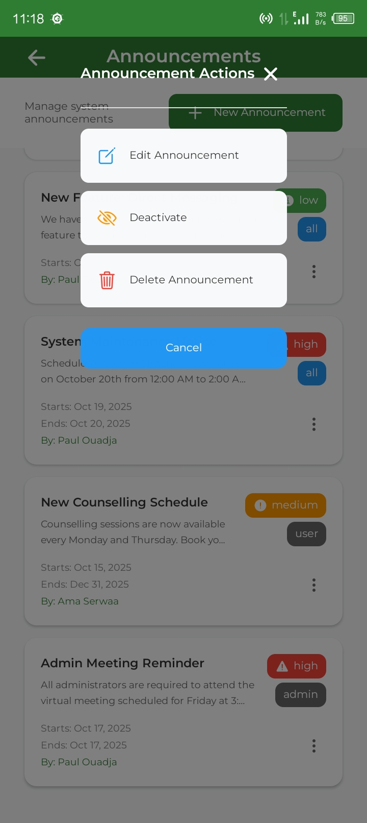 - Admin announcement system and content management