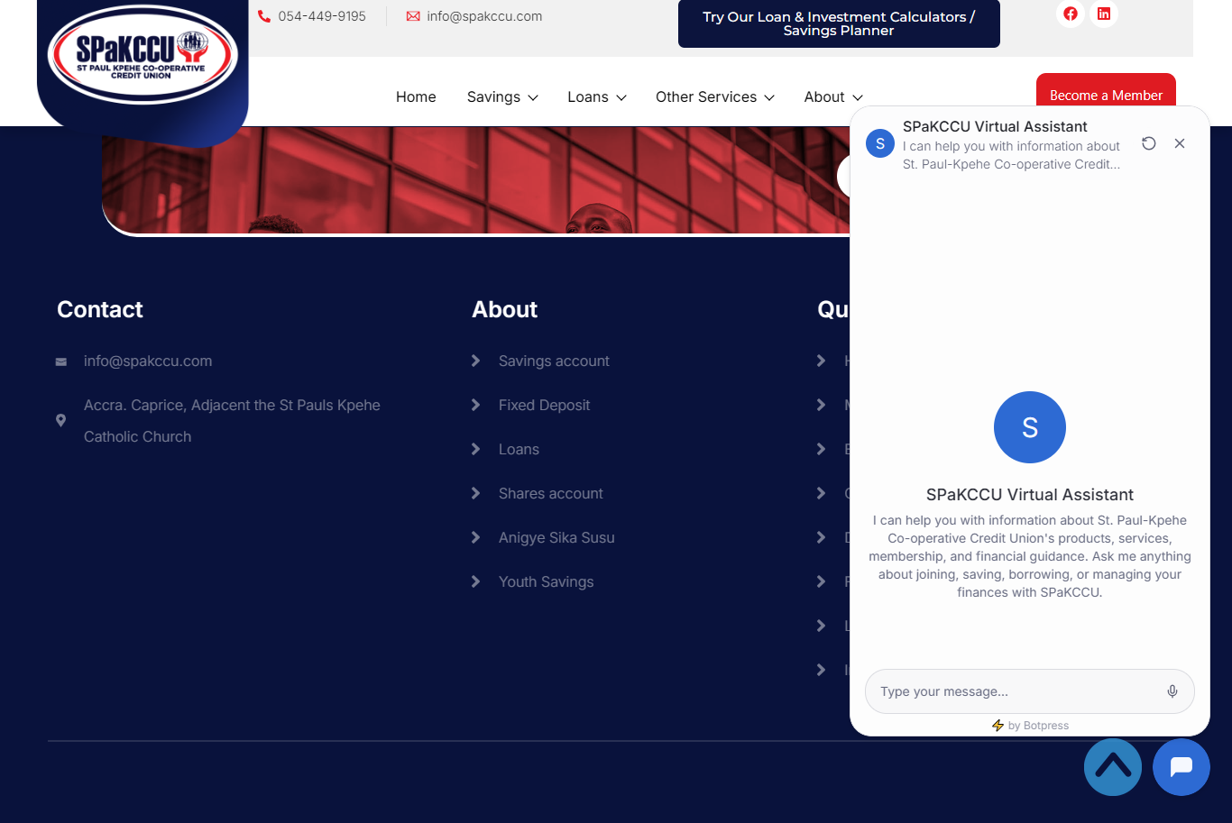 A complete redevelopment of the SPaKKCU Microfinance digital platform, designed to improve accessibility, performance, and member engagement. The system provides interactive loan, savings, and investment calculators, a customer account registration module, and an AI-powered virtual assistant for real-time support. The platform was migrated to AWS S3 and CloudFront, ensuring high availability, improved load time, and secure content delivery.